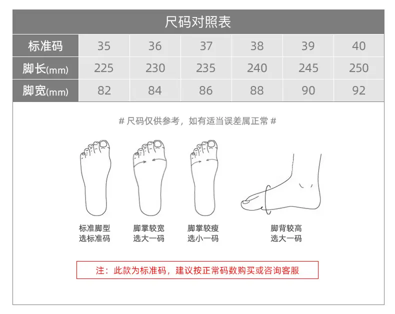 每款寶貝出廠的時候都會經(jīng)過標準腳碼試穿,因每個人的腳型不同,感覺也會不同,對于尺碼我們只提供建議,具體 尺碼選擇請根據(jù)個人腳型的實際情況來選購,尺寸問題不作為退換貨標準。如有疑問,可以咨詢客服。